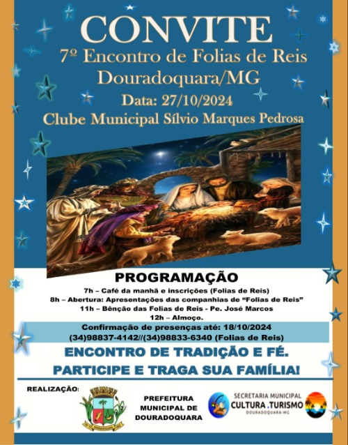 A Prefeitura Municipal de Douradoquara, gestão 2025-2028, por intermédio da Secretaria Municipal de Cultura e Turismo, promoverá o tradicional Encontro de Folias de Reis.